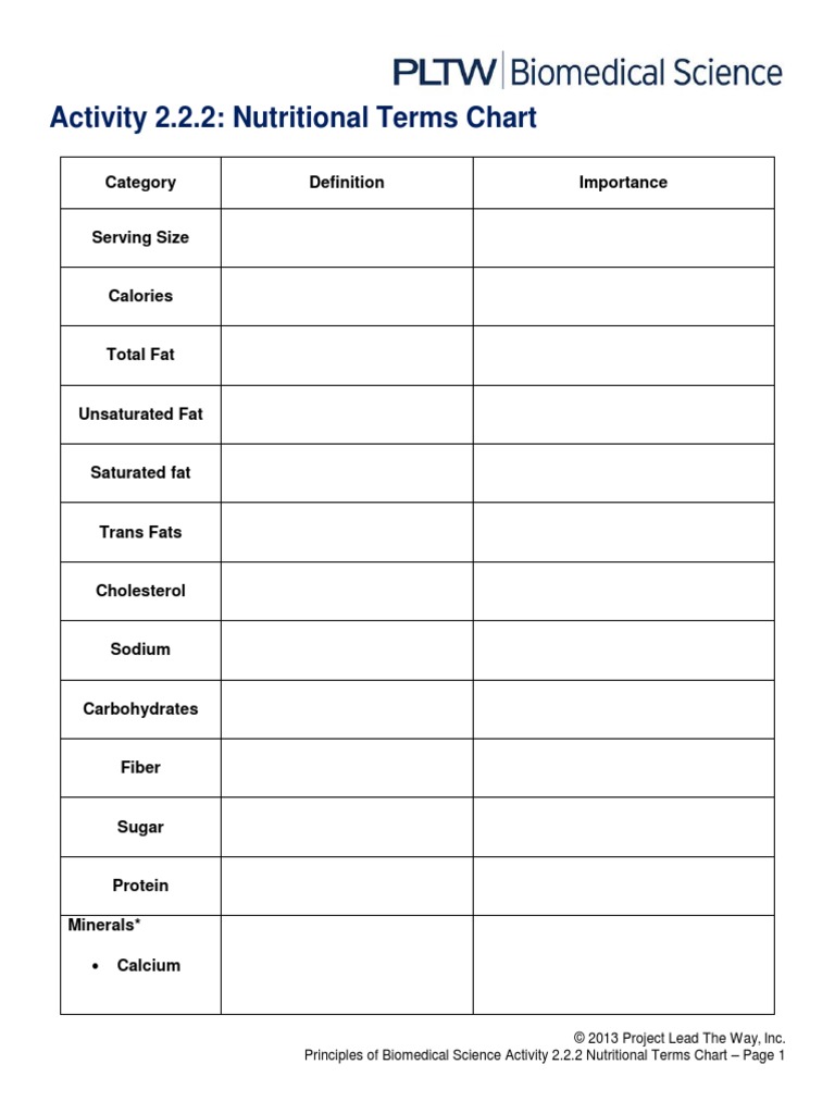 Start studying 222 Nutritional Terms Chart. Nutritional Terms Chart Category Definition Importance Serving Size Calories Total Fat Unsaturated. Principles of Biomedical Science Activity 222.