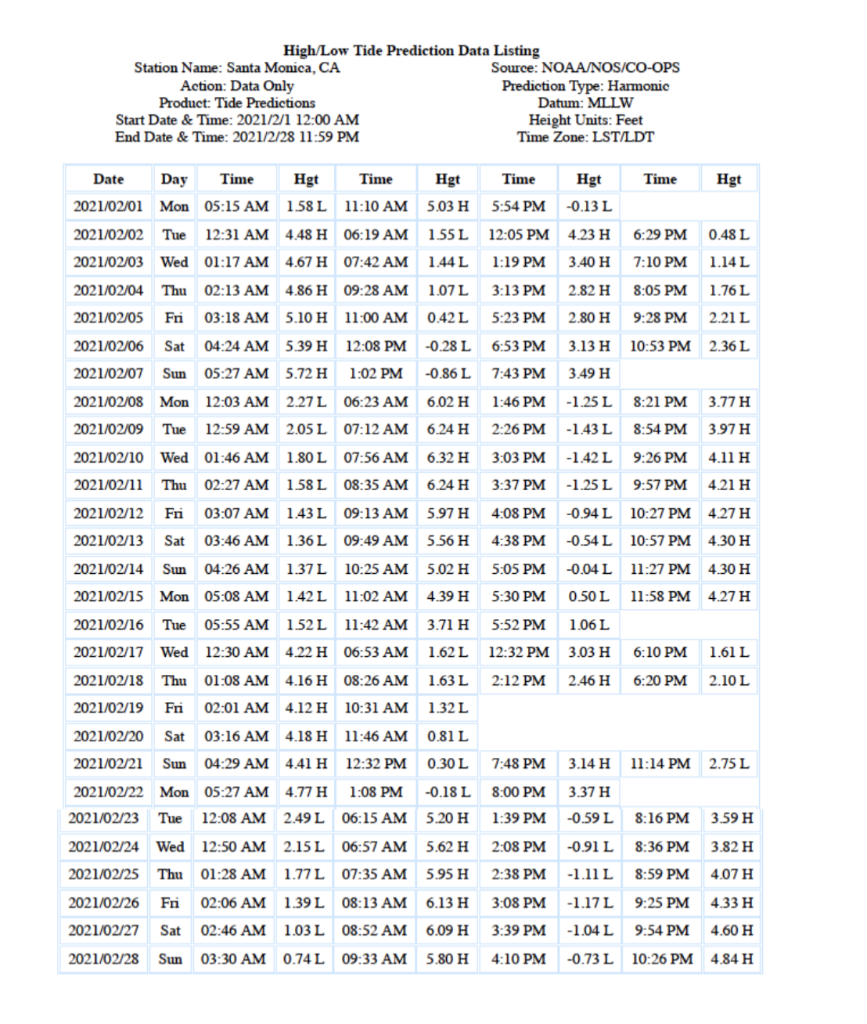 Santa Monica Tides 7 Day Table Chart Tide Times