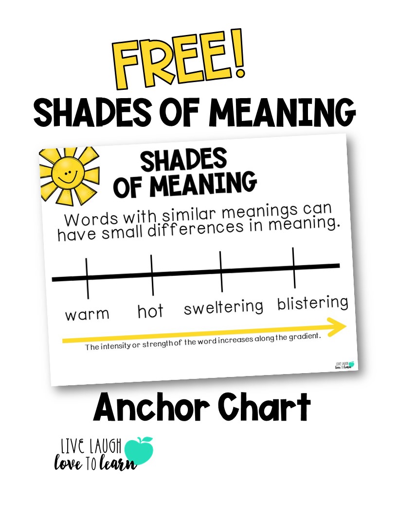 Add student answers and definitions to anchor chart. A colorful Shades of Meaning anchor chart Two pages of Shades of Meaning assessments. This shades of meaning activity has been updated and now includes a digital distance learning component in Google Slides and Google Forms.