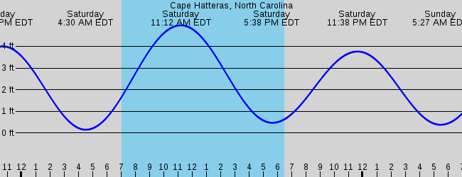 The tide chart above shows the height and times of high tide and low tide for Cape Hatteras North Carolina.